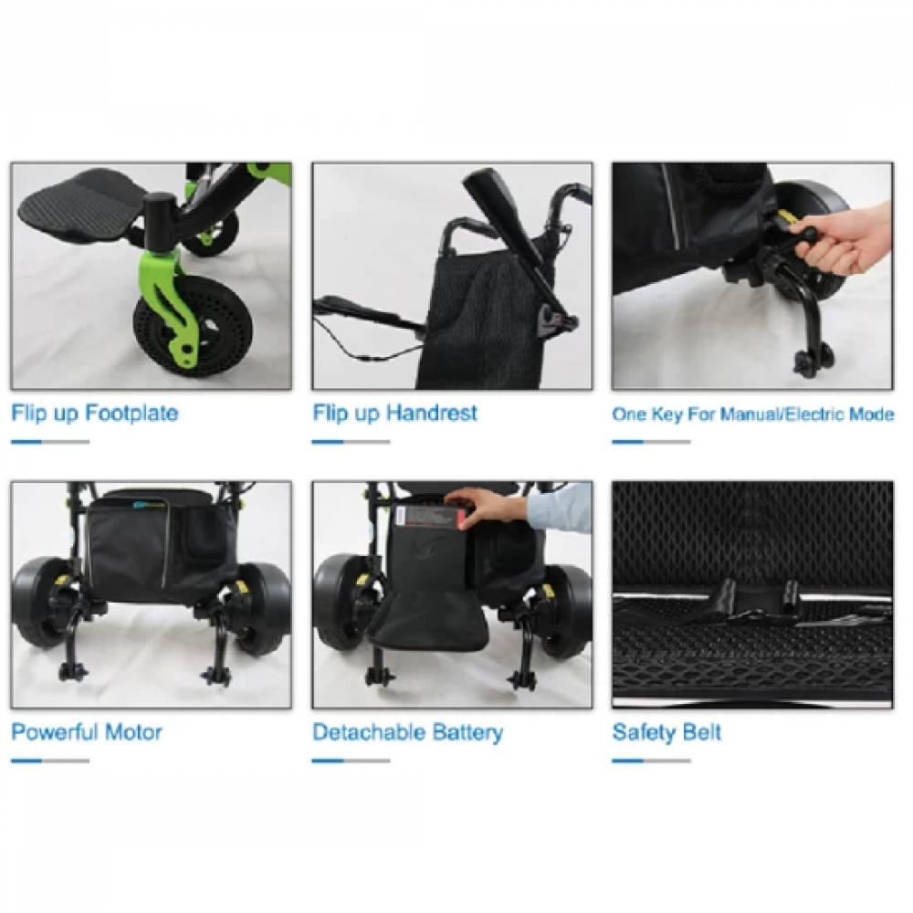 السلامة: تكمن أساسيات السلامة والأمان في هذا الكرسي المتحرك الكهربائي، في نظام أمان شامل يحرس مستخدمه. تتواجد فرامل تثبيت يدوية تؤمن الكرسي في مكانه، بالإضافة إلى فرامل ذاتية توقفه تلقائيًا عند ترك جهاز التحكم. ولا يكتفي بذلك، فقد تم تجهيز الكرسي بحزامٍ للأمان لتزود المستخدم بحماية إضافية من السقوط. مع عجلات من البولي يوريثان التي تعطي القوة والثبات والحماية من الانزلاق لتتمكن من الحركة على جميع أنواع الأسطح.
